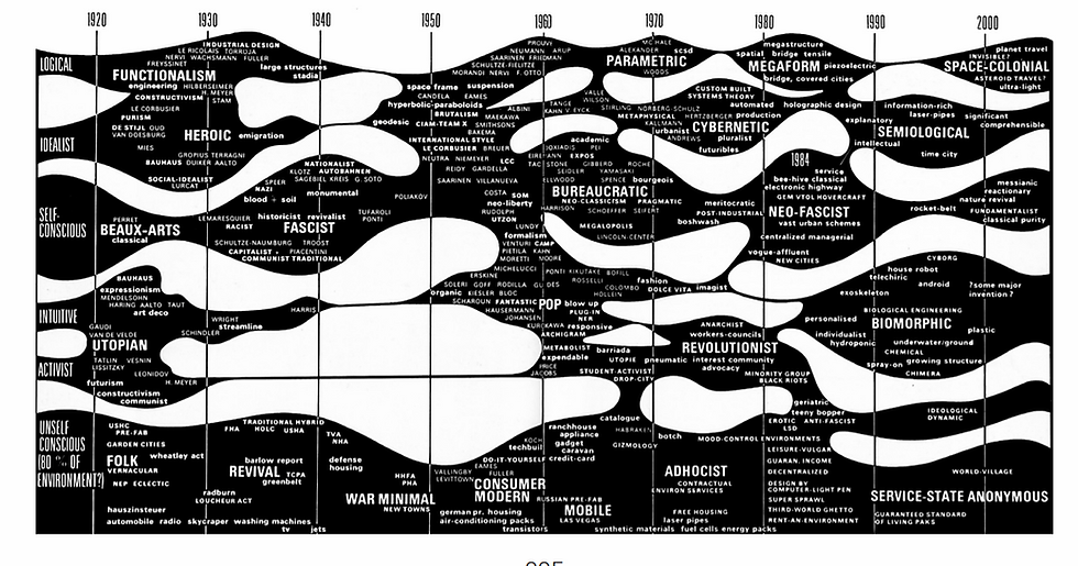Mediante una línea de tiempo, conjunto a un mapa, se trata de explicar el concepto de lo contemporáneo con un ejercicio clasificativo. En sus ensayos "Pluralism vs. The Cloud" de Lydia Kallipoliti y "What is Contemporary?" de Giorgio Agamben, ambos autores abundan sobre sus ideas de a lo que podría referirse el término. Por un lado, Kallipoliti observa desventajas en el pluralismo y Agamben, por su parte busca variadas definiciones del concepto en sí.